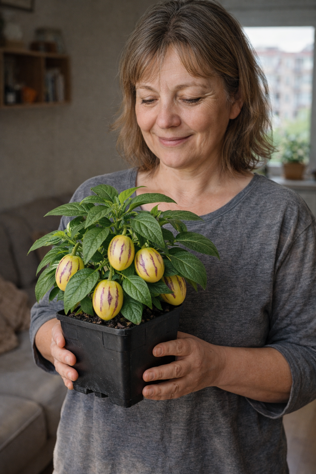 Брала через цікавість, думала — буде просто зелень. Але вже другий раз знімаю плоди. Стоїть на заскленому балконі, виглядає гарно і ще й родить. Для квартири — дуже вдалий варіант, не вибагливий.